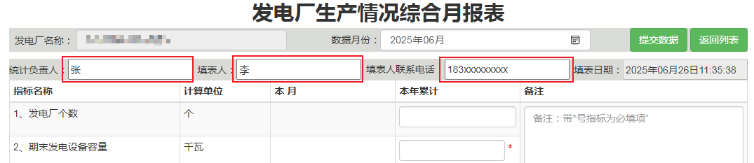 为了便于联系填报人员,请在填报数据时,填写填表人联系方式,或补充厂站人员信息。
